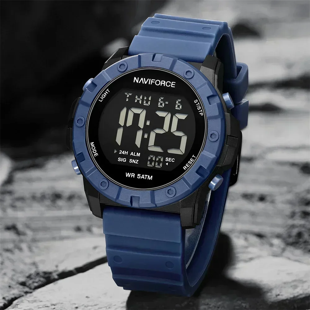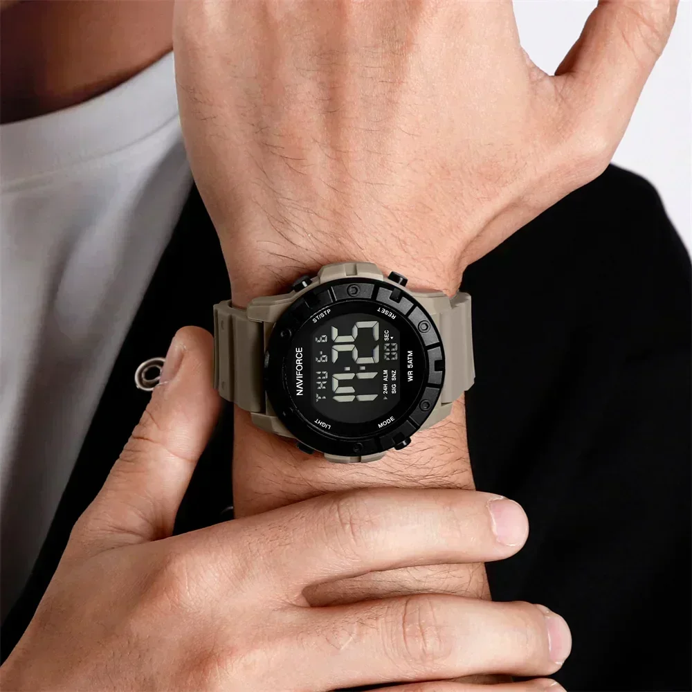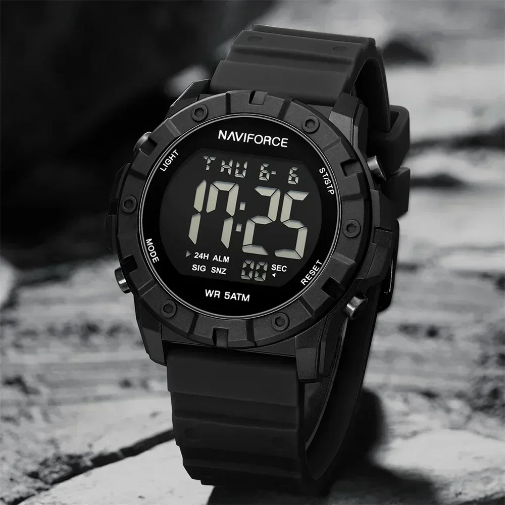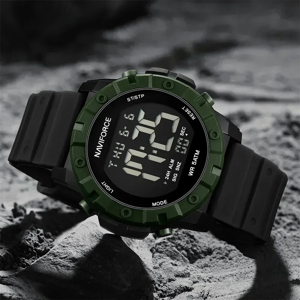 Diseñado para hombres que valoran la funcionalidad, este reloj combina movimiento digital de alta exactitud con estructura deportiva de resina y silicona, garantizando resistencia y comodidad en toda circunstancia.