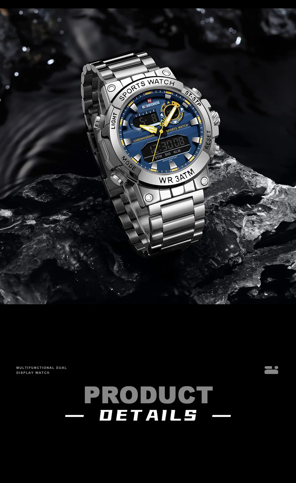 📐 Especificaciones técnicas: Marca: NAVIFORCE Modelo: NF9237 Movimiento: Cuarzo japonés + Digital Estilo: Militar, Deportivo (SPORT) Diámetro del dial: 45–49 mm Grosor de la caja: 16 mm Forma del dial: Redondo Material de la caja: Acero inoxidable Cristal del dial: Hardlex Correa: Acero inoxidable Ancho de la correa: 20–24 mm Longitud de la correa: 24 cm Cierre: Cierre de pulsera Resistencia al agua: 3 BAR (30 metros) Origen: China Incluye batería y caja de papel de marca